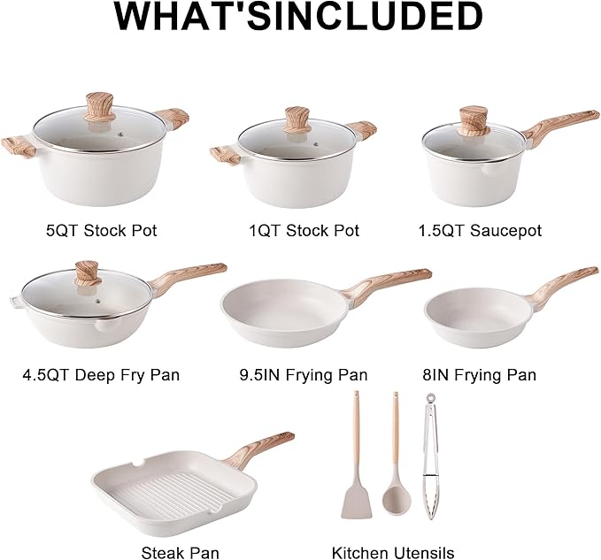 Caannasweis 20Pcs Cookware Sets, Nonstick Pots and Pans Set, Granite Induction Cookware, Non Stick Kitchen Cooking Set, Grayish White Grill Pan Set, PFOS PFOA Free