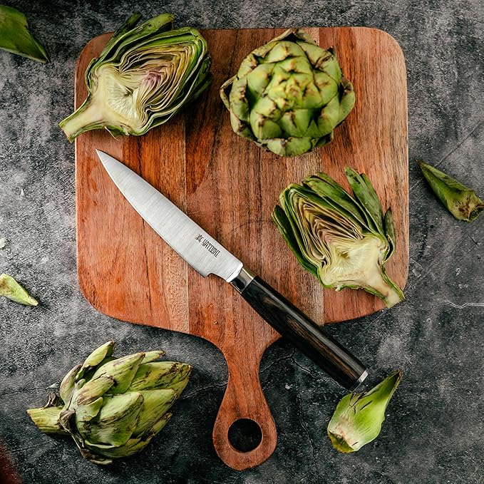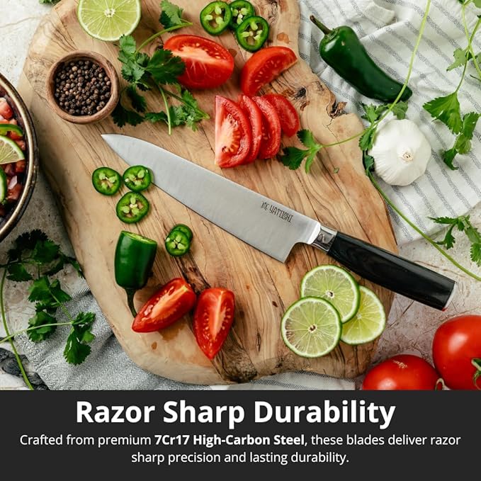 • High Carbon Blades: Made with premium 7Cr17 High Carbon Steel that provides a razor-sharp professional quality blade. The steel contains 0.6-0.75 carbon, making it two times tougher than other knives in its class with a Rockwell Hardness of 57-58.