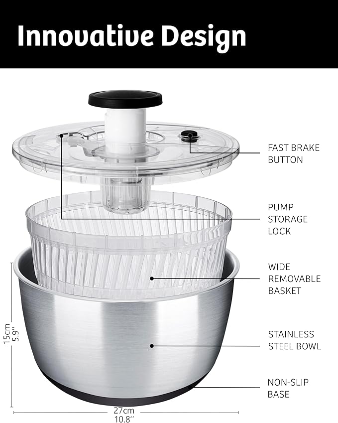 • Smart Design - The non-skid base provides stability and control, so the bowl container remains steady on your counter while using the fruit cleaner lettuce spinner pump; Features a brake button for spin control at your fingertips - simply press to stop