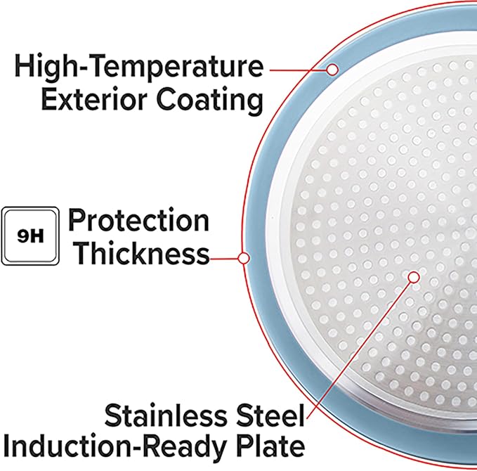 • DURALON BLUE HARDNESS – Hardness is rated at 9H. Since diamond is rated at 10H, It is extremely strong. It has HIGH resistances to abrasion, corrosion, and acid meaning it won’t chip or discolor and will retain its non-stick properties longer.