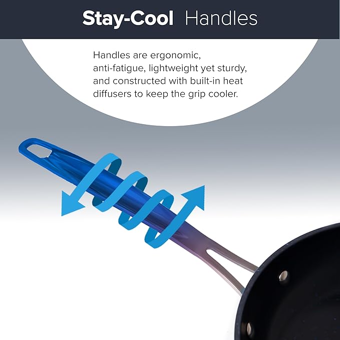 • ERGONOMIC STAY-COOL SS HANDLES – One of the most important parts of any cookware is the handle. The handles are stainless steel, ergonomic, anti-fatigue, lightweight yet sturdy, and with heat diffuser built in to keep the grips reasonably cooler longer.