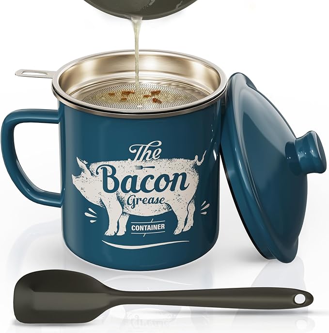 • [Safe Materials] - Both the high temperature resistant enamel grease container and the removable strainer made of food grade 304 stainless steel prevent corrosion and breakage. And not easily deformed. The spatula made of food-grade silicone can easily scrape away solidified grease and can also be used for spreading and stirring ingredients.