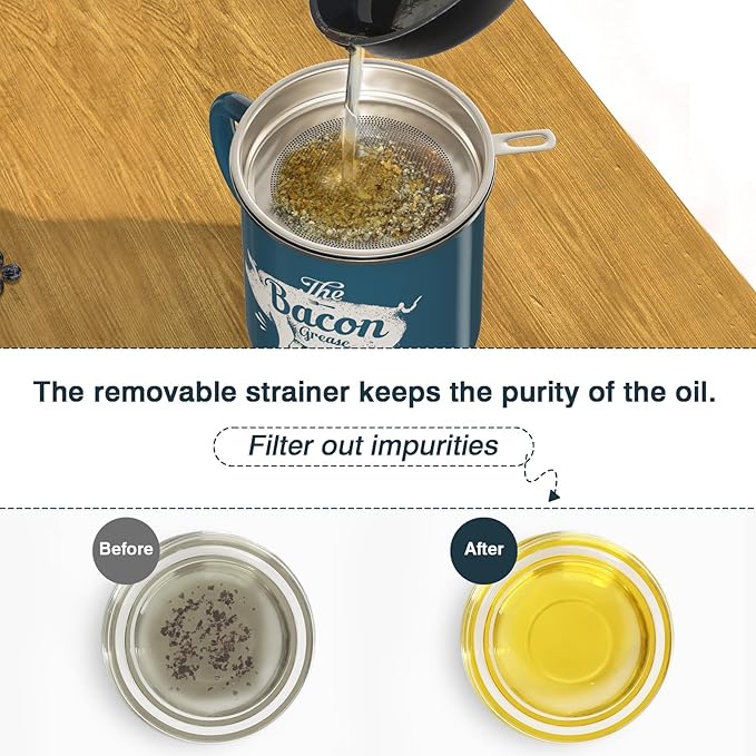 • [Health & Hygiene] - The lid fits snugly over the container to prevent dust from entering and odors from spreading, keeping the grease longer-lasting. The removable fine mesh strainer filters grease and separates food from fat, leaving clean bacon grease and reducing fat intake.