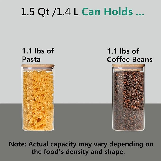 • [Product Capacity] 3 Round jars with , dimensions are 3.94x8.1 inches(10cmx20.6cm),It can store cookies, candy, flour, rice, beans, spice, cereals etc.Note: This glass jar is not suitable for Spaghetti