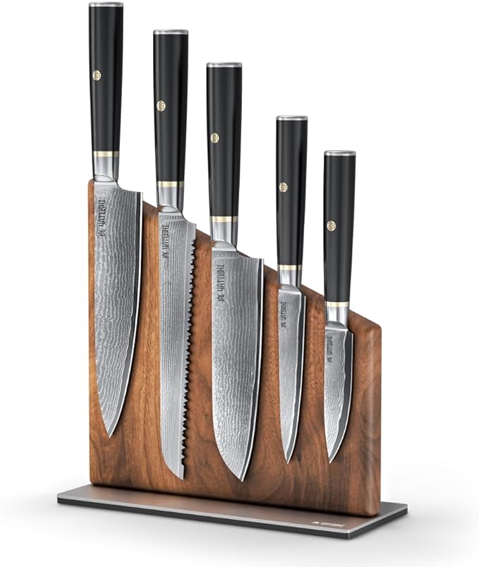 Yatoshi Magnetic Kitchen Knife Block Set 6 Pcs - Japanese 67 Layer High-Grade VG-10 Damascus Steel Knives, Sharp, G10 Handle Professional Kitchen Knife Set