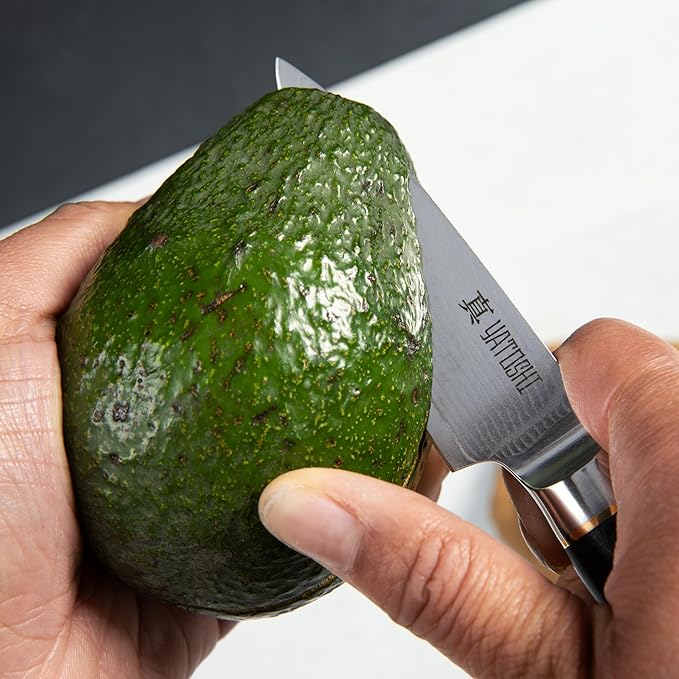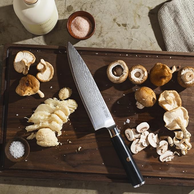 • High-Quality Blades: The blade features a VG-10 cutting core enveloped by 67 layers of stainless-steel Damascus cladding. With a Rockwell Hardness of 60-61, it boasts a meticulously hand-shaped Japanese double-bevel angled at 16° on each side.