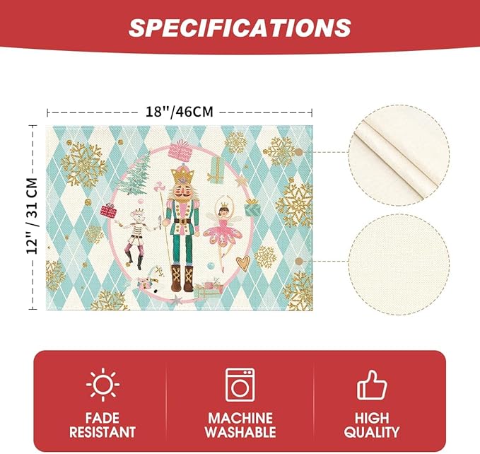 Blue Diamond Plaid Nutcracker Christmas Placemats Set of 4, 12x18 Inch