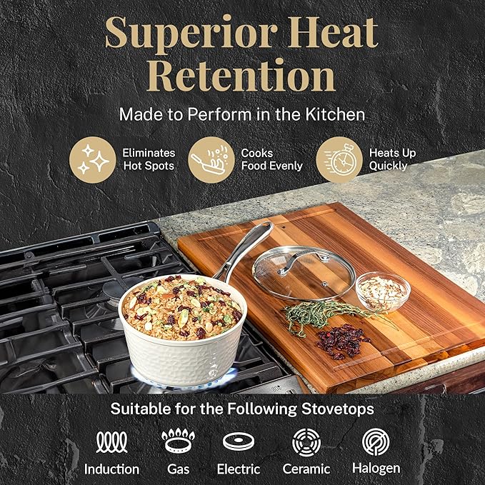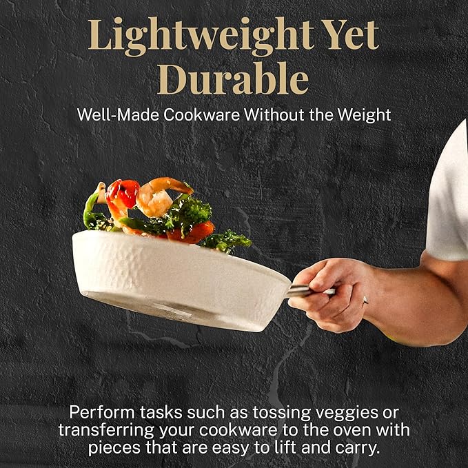 - ELEGANT HAMMERED DESIGN: Each piece of cookware features a classy, hammered design created to add style to any kitchen, providing a professional cooking experience at home without compromising any style.