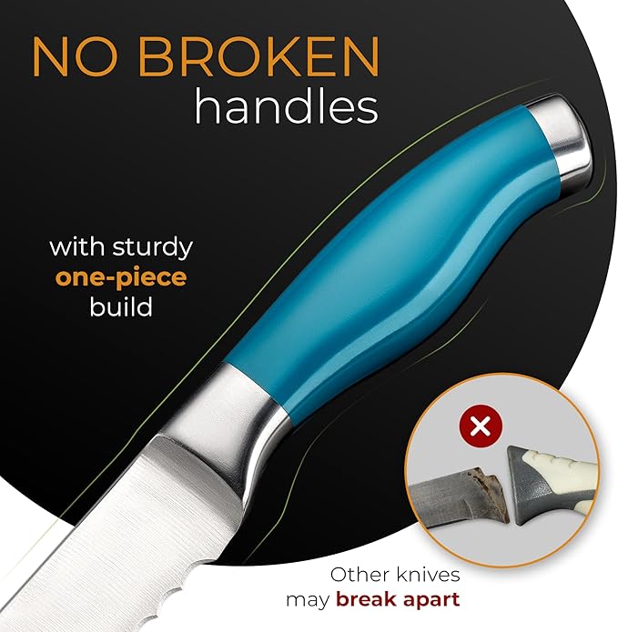 • ULTRA-SHARP, CUTS EFFORTLESSLY: The Orblue Serrated Bread Knife blade has an ultra-sharp serrated edge that grips and effortlessly slices the toughest loaves of bread, to provide a smooth, clean cut. The blade runs 10 inches long with a 5-inch handle. Included as an added safety measure on the knife’s sharp tip is a rubber safety guard.