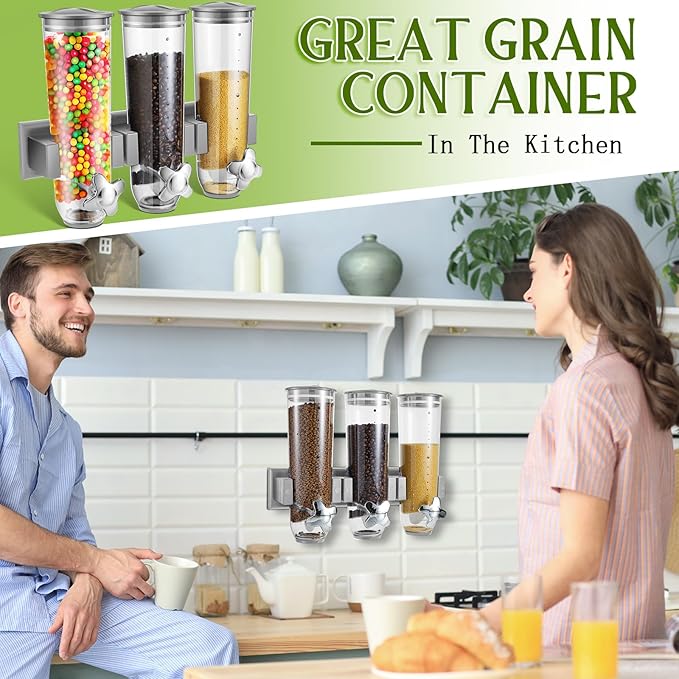 • Multiple Applications: this wall mounted dry food dispenser is helpful for storing and dispensing cereal, candy, nuts, coffee, beans, rice, grain, oatmeal, tea, snacks and more, avoiding messing up and keeping your kitchen neat