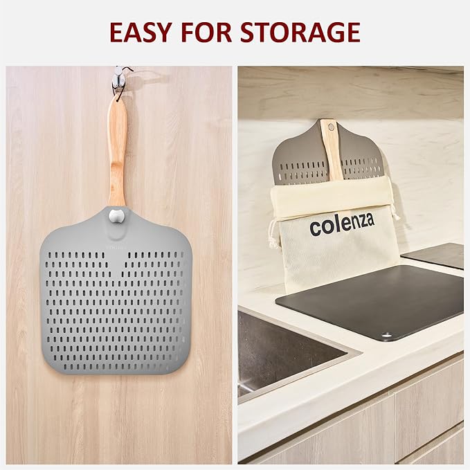 • ROTATING HANDLE AND CLOTH BAG FOR EASY STORAGE: set up/store your pizza peel without any tool! Simply loosen/tighten the handle of the pizza peel with just your hand and store your pizza peel in the cloth bag to prevent dust/scratches