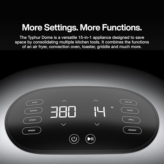 - ๐ญ๐ฑ-๐ถ๐ป-๐ญ ๐ ๐๐น๐๐ถ๐ณ๐๐ป๐ฐ๐๐ถ๐ผ๐ป๐ฎ๐น ๐๐ผ๐ผ๐ธ๐ถ๐ป๐ด | The Typhur Dome 2 is designed to save space by consolidating multiple kitchen tools in to one. Itโs capable of 15 cooking functions, including Pizza, Bacon, Steak, Wings, Fries, Frozen, Air Fry, Toast, Grill, Bake, Griddle, Roast, Broil, Dehydrate, and Reheat, covering nearly every cooking need.