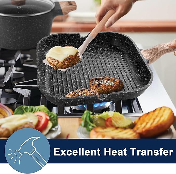 • Caannasweis Cookware Set: It comes fully equipped with a wide array of kitchen tools. Whether you're preparing simple daily meals or hosting a grand family gathering, this set can handle it all with ease. The meat cooked on the ridged edge of the griddle has unique grill marks, which are just like the feeling of a summer camping trip.