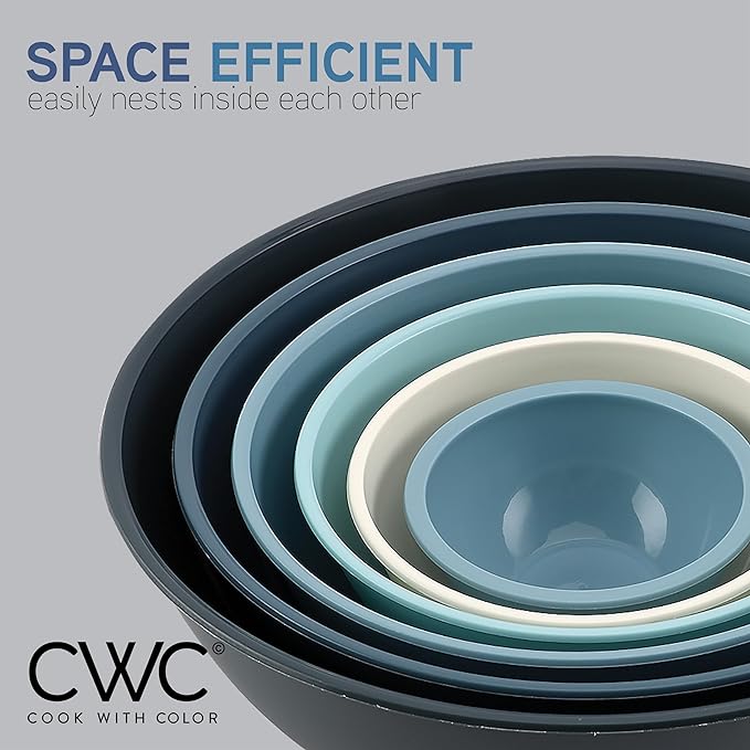 COOK WITH COLOR Mixing Bowls with Non Slip Bottom - 12 Piece Plastic Nesting Bowls Set includes 6 Prep Bowls and 6 Tritan Lids - Microwave Safe (Blue)