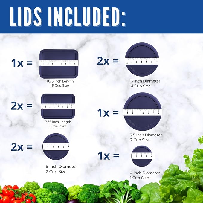 • 9 PC SET BLUE: Includes lids for Pyrex - (1) 1-Cup (7202-PC), (2) 2-Cup (7200-PC), (2) 4-Cup (7201-PC), (1) 6/7-Cup (7402-PC), (2) 3-Cup (7210-PC), and (1) 6-Cup (7211-PC)