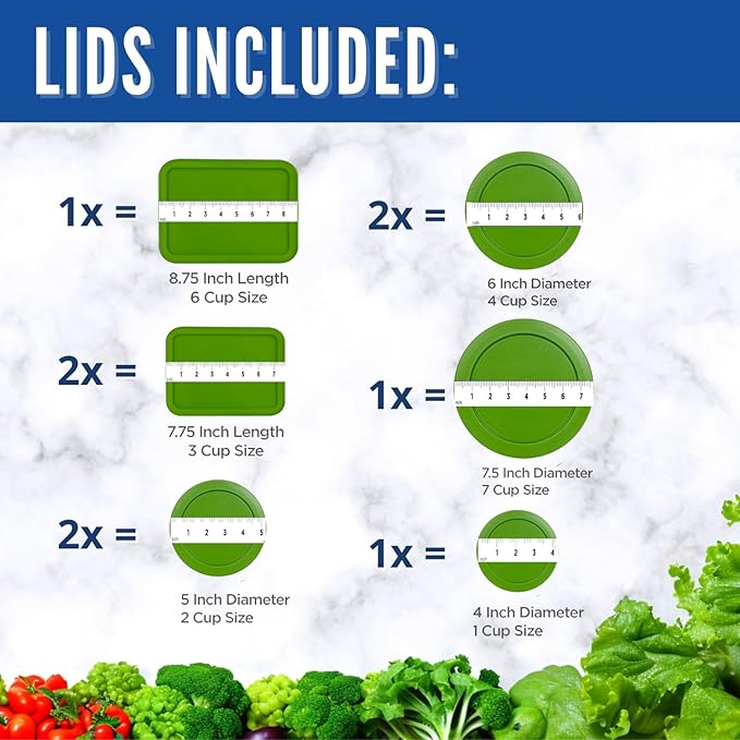 • 9 PC SET GREEN: Includes lids for Pyrex - (1) 1-Cup (7202-PC), (2) 2-Cup (7200-PC), (2) 4-Cup (7201-PC), (1) 6/7-Cup (7402-PC), (2) 3-Cup (7210-PC), and (1) 6-Cup (7211-PC)