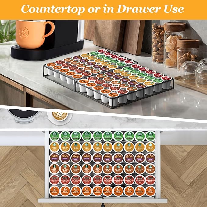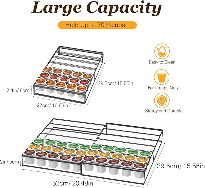 • 【Countertop or Drawer Use】Our coffee pod holder measures 10.63 "L x 2.4 "H x 15.55 "W (expandable to 20.48 "W). Its compact design allows for flexible placement on countertops, cabinets or drawers (drawer height must be greater than 3 inches).