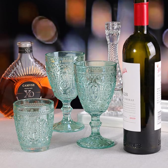 • 🍷What You Get: Set of 4 green wine glassware, measures 3.4"diameter, 6.6"High and the perfect size.The green glassware set with vintage embossed like rystal with an old-fashioned flair! Sturdy and oh-so-lovely! They can bring sophistication to your red wine and add a sense of ambience to your meal.