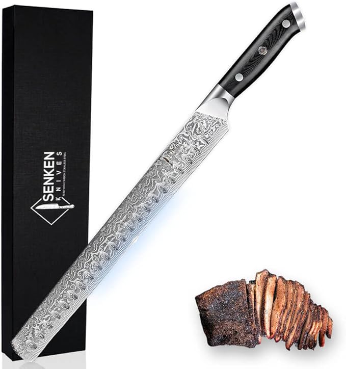 SENKEN 12" Damascus Steel Brisket Knife - Shogun Collection - 67-Layer Japanese VG10 Steel w/Full-Body G10 Military Grade Handle - Ultra Sharp Carving Knife for Brisket, Meat, Roasts, and Large Fruit