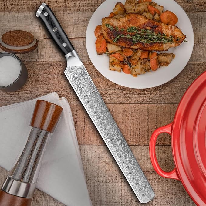 • 【 67-Layer Damascus Steel 】 Masterfully forged from premium Japanese VG-10 Steel into 67-layer folded Damascus for extreme sturdiness and razor-sharp cutting. The Shogun 12" Brisket Knife is built to last so that you never need another brisket knife again.