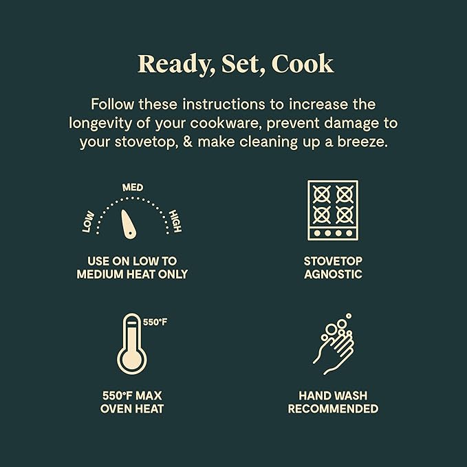 • EFFICIENT USE & CLEANING: Utilize the efficient heat retention of ceramic coated pans by cooking on low to medium heat. A dash of oil or butter is all you need for food to effortlessly glide. Enjoy easy cleanup with a simple and gentle scrub.