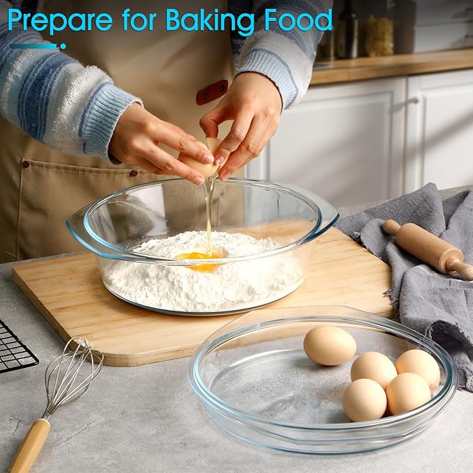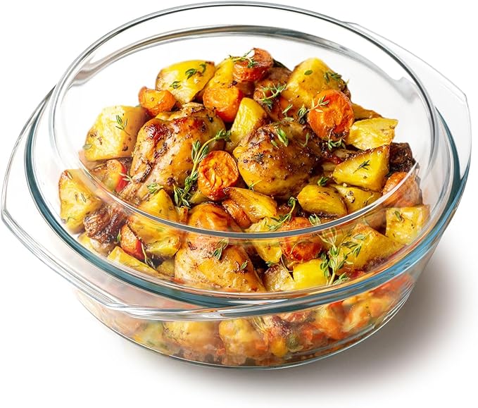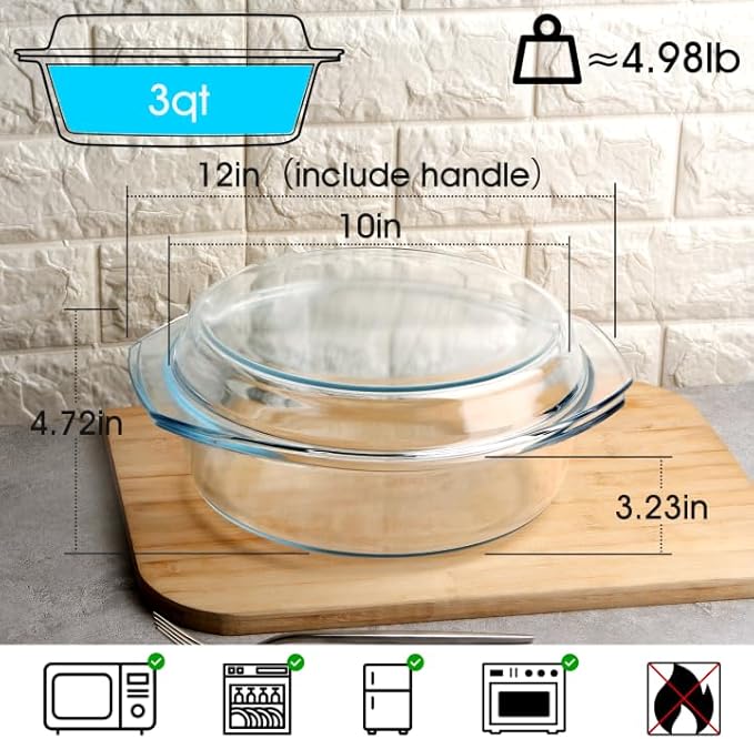• 【Large Capacity】With a generous capacity of 3 liters, this round glass casserole dish allows you to cook large portions of food, perfect for family meals or gatherings. It provides ample space to prepare your favorite recipes and can easily accommodate multiple servings. Whether you're cooking casserole,baked potatoes, or a savory stew, this dish has the capacity to handle it all.