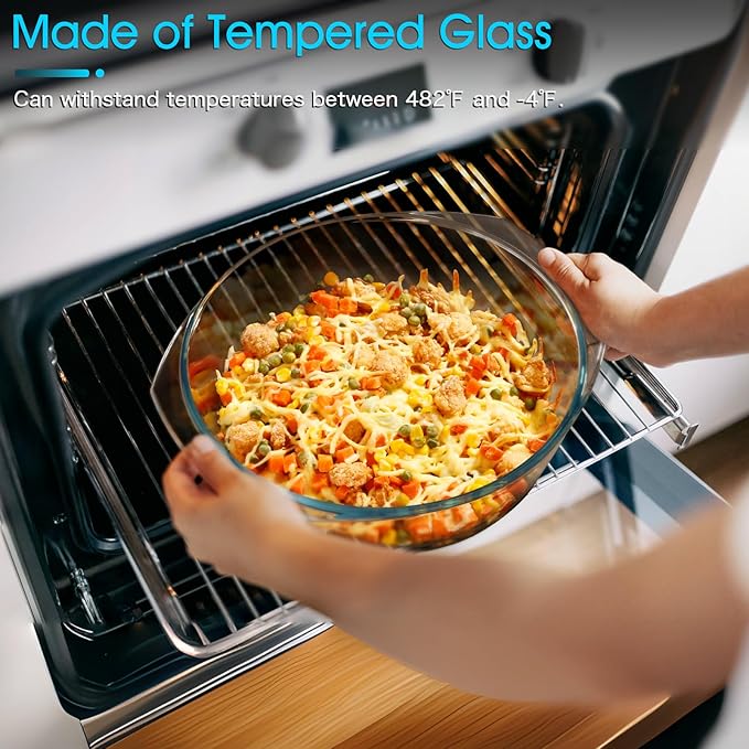 • 【Made From Tempered Glass】Round glass casserole dish can withstand temperatures between 482° F and -4° F without worrying about thermal shock breaking it. Note handle-to-handle width: 12inch. May not fit small microwaves. Please measure your microwave interior before use if needed.
