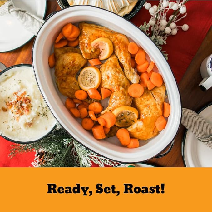 Granite Ware 15 inch oval roaster with Lid (Speckled White) enameled steel design to accommodate up to 10 lb poultry/roast. Resists up to 932°F