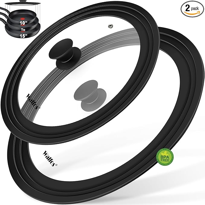 Walfos 2 Pcs Universal Pot Lids, Frying Pan Lid with Heat Resistant Silicone Rim, Fits All 10", 11", 12" to 13", 14", 15" Diameter Cookware, Pots, Pans and Skillets, BPA Free and Dishwasher Safe