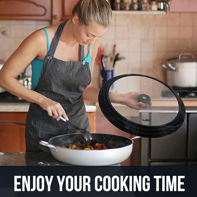 • 【NEW UPGRADED DESIGNED】Our lightweight 3 -in-1 pan lids with vent comes in 3 various sizes. Walfos regular size universal lid Fit ALL pans & pots with diameter 10", 11" and 12". The extra size universal lid Fit ALL pans & pots with diameter 13", 14" and 15".