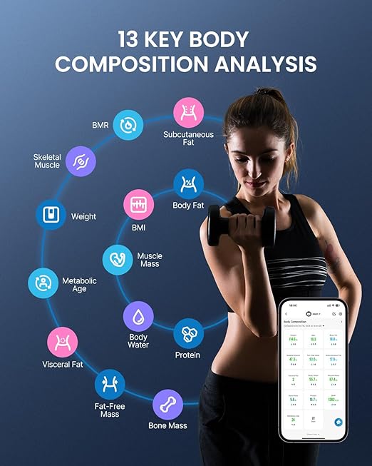 • Get to Know Your Fitness Journey: Ready to take your health and fitness to the next level? Sync your data with the Renpho Health App for a comprehensive fitness journey. Track 13 detailed measurements, including body water, bone mass, metabolic age, weight, BMI, body fat, BMR, and so on. The app seamlessly integrates with popular health tracking apps like Samsung Health, Fitbit, and Apple Health.