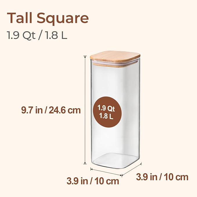• Clear Kitchen Jars: Enhance your kitchen organization with our square square glass containers, featuring a transparent design; the see-through glass allows effortless monitoring of food levels, enabling you to track usage and assess food storage condition