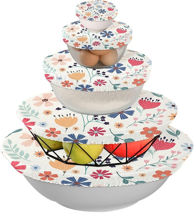 5 Pcs Bowl Covers Reusable in 5 Size Elastic Food Cover Cloth Lids Fresh Keeping Dish Cookware Bakeware Fabric Covers Lids for Food Leftovers Fruits Storage Flower Collection
