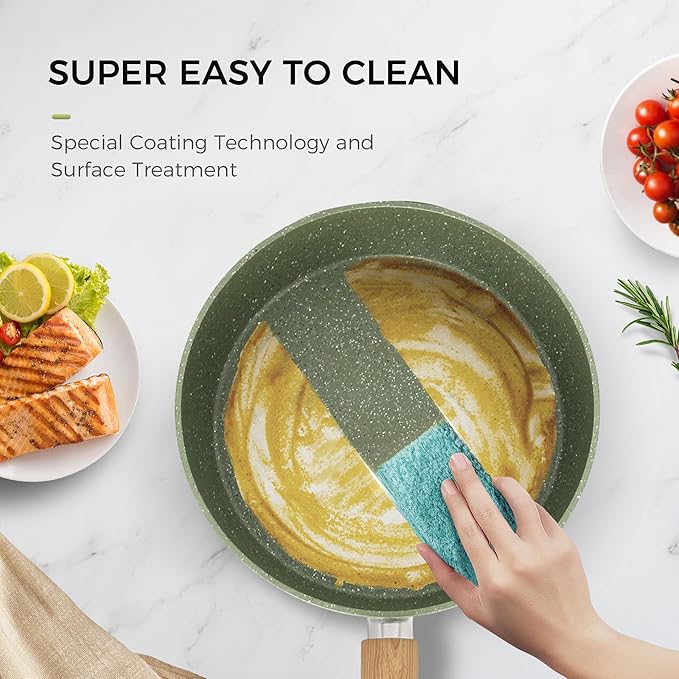• Nonstick Granite Stone Coating: The pots and pans set features a durable granite stone coating that ensures easy food release and quick cleanup. The coating is also scratch-resistant and safe for use with metal utensils