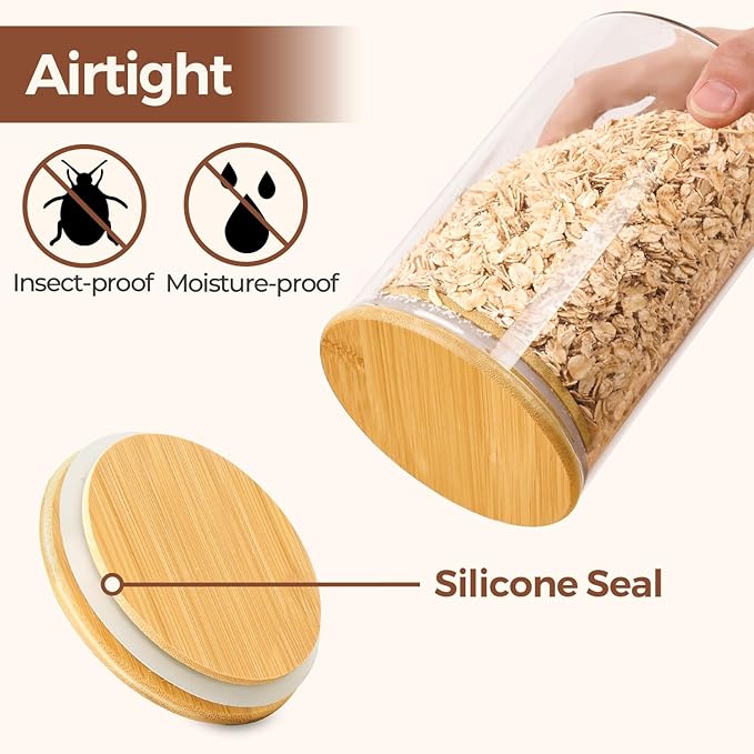 • Versatile Glass Canisters: our 1Qt glass pantry storage containers ideal for storing cereals, cookie, snacks, nuts, oat, or even can use glass jars as meal prep jars, salad jars, candy jar, bath salt jars, spice jars, sugar coffee containers