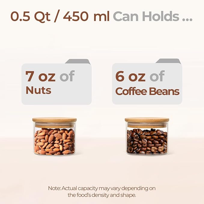• Versatile Glass Canisters: The food storage jars are suitable for storing various ingredients, snacks or cookie, tea, candies, coffee bean, dried fruits, nuts and spices; you can aslo use the small glass jars as meal prep jars or salad jars