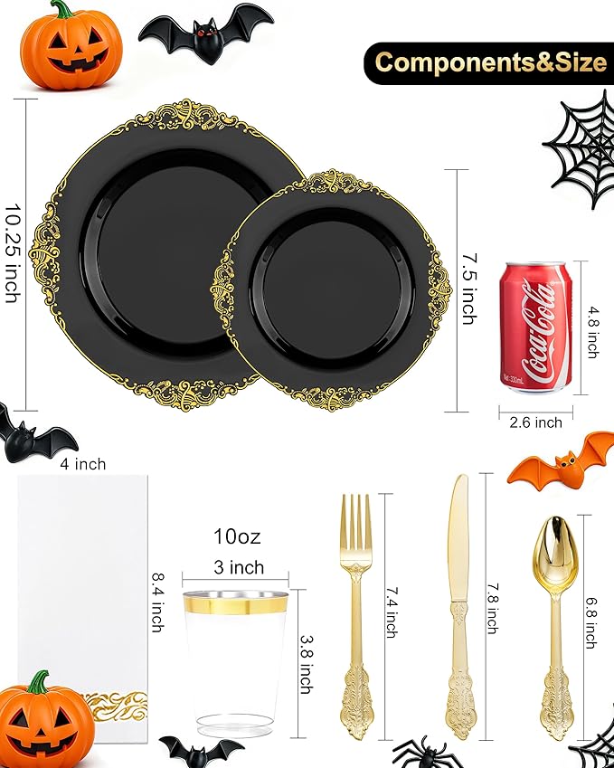 • Premium Quality: Made from premium food-safe plastic, these black plastic dinnerware sets are designed for one-time use, making them perfect for large-scale events, parties, or catered affairs where ease of cleanup is paramount. Despite being disposable, our black gold plates maintain a sturdy construction that can hold a variety of meal portions without bending or breaking under weight.
