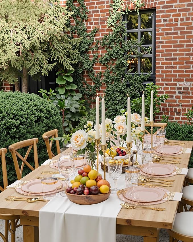 - Premium Quality: Made from premium food-safe plastic, these pink plastic dinnerware sets are designed for one-time use, making them perfect for large-scale events, parties, or catered affairs where ease of cleanup is paramount. Despite being disposable, our pink gold plates maintain a sturdy construction that can hold a variety of meal portions without bending or breaking under weight.