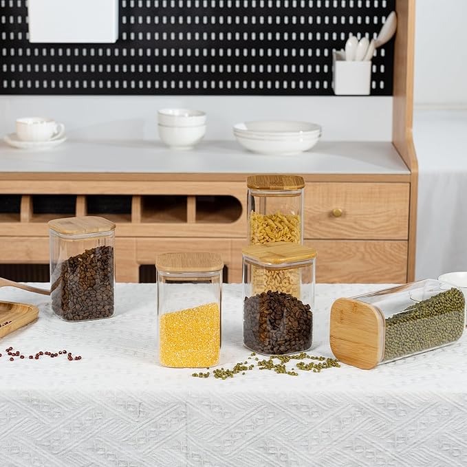 • [Transparent jar]- Transparent square glass containers make your items visible, allowing you to clearly see the contents of the glass storage jar and the remaining stock, and then you can easily replenish the food that is about to run out.
