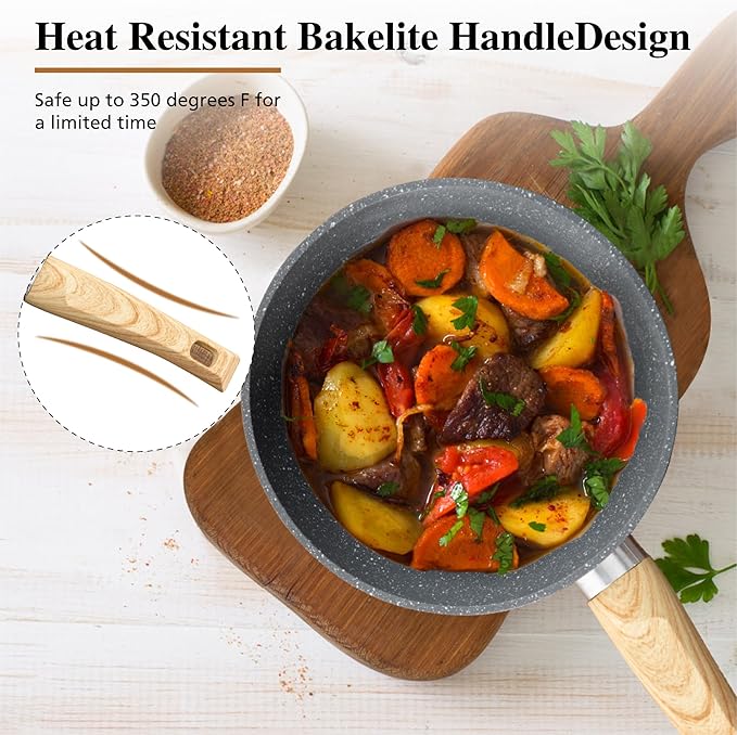 • 𝐓𝐡𝐨𝐮𝐠𝐡𝐭𝐟𝐮𝐥 𝐃𝐞𝐬𝐢𝐠𝐧 𝐟𝐨𝐫 𝐏𝐫𝐚𝐜𝐭𝐢𝐜𝐚𝐥𝐢𝐭𝐲 : Anti-scald handles keep your hands safe, while the deeper pan shape allows for versatile cooking techniques, from stir-frying to simmering. Versatile cookware set for various cooking methods