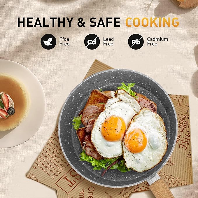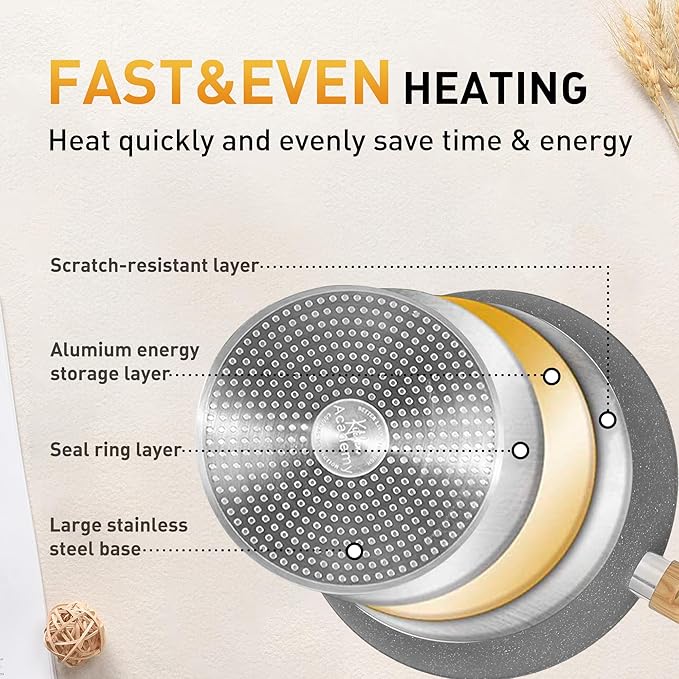 • 𝐄𝐯𝐞𝐧 𝐇𝐞𝐚𝐭𝐢𝐧𝐠 𝐓𝐞𝐜𝐡𝐧𝐨𝐥𝐨𝐠𝐲: Our pots and pans does not contain PFOS, The set's even heating technology guarantees uniformly cooked meals. No more hot spots or unevenly cooked food – every dish is a masterpiece. Nonstick pan set for precise cooking