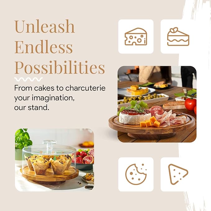• Shatterproof Cake Platter - This wooden cake stand is crafted from the finest acacia wood & resilient acrylic plastic, this spinning cake stand is a powerhouse of durability! Unlike a fragile glass cake dome, the acrylic cake dome is lightweight, easy to clean & built to last