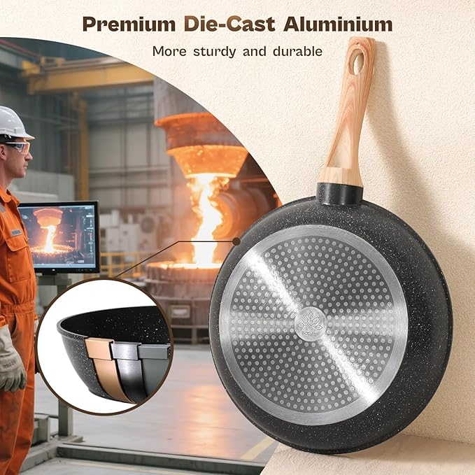 • Die-Cast Aluminum Construction – Engineered for even heat distribution and long-lasting durability, each piece is crafted from premium die-cast aluminum that heats up quickly and cooks food evenly—eliminating hot spots and ensuring consistent results.