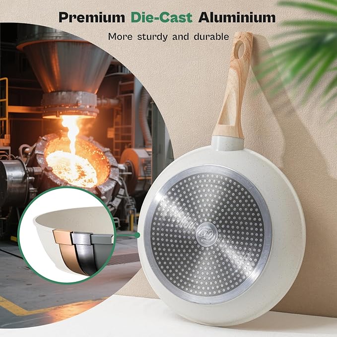 • Die-Cast Aluminum Construction – Engineered for even heat distribution and long-lasting durability, each piece is crafted from premium die-cast aluminum that heats up quickly and cooks food evenly—eliminating hot spots and ensuring consistent results.