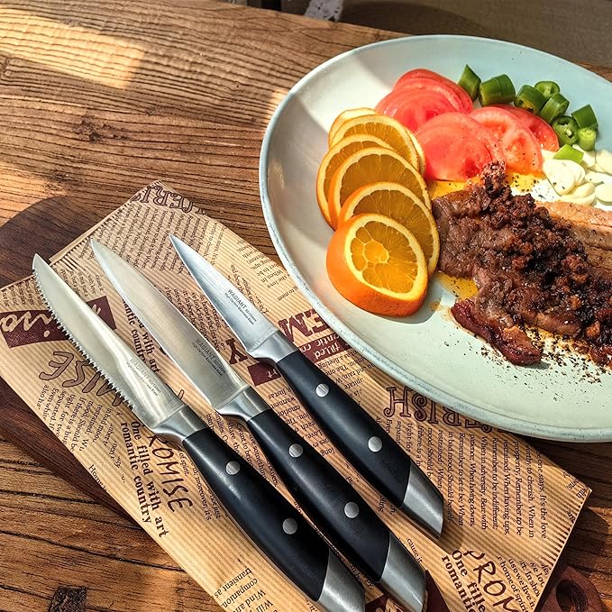 • Utility-driven Set: Includes a 3.5” paring knife, 5” serrated blade steak knife, and 5” versatile knife, perfect for daily kitchen tasks.