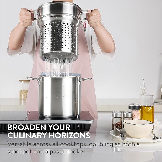 • EFFICIENT HEAT DISTRIBUTION: The pasta pan features an encapsulated base for faster and even heat distribution. This improves cooking efficiency and helps to prevent hot spots, for perfect cooking results.