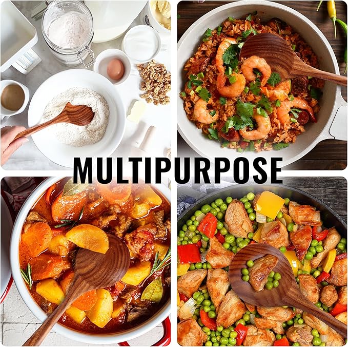 • SCRATCH-FREE DESIGN: Designed to protect non-stick, ceramic, and cast iron cookware, this premium teak wood spoon is lightweight, sturdy, and gentle on surfaces. Perfect for everyday cooking without worrying about scratches or damage.