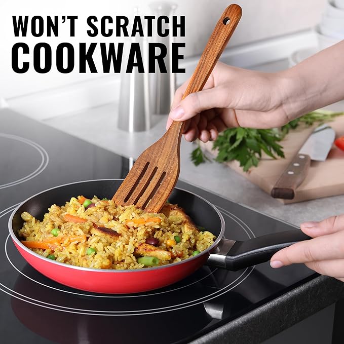 • SCRATCH-FREE DESIGN: Protect your non-stick, ceramic, and cast iron cookware with this premium teak wood spoon. Lightweight yet sturdy, it glides smoothly without scratching surfaces, ensuring long-lasting use.