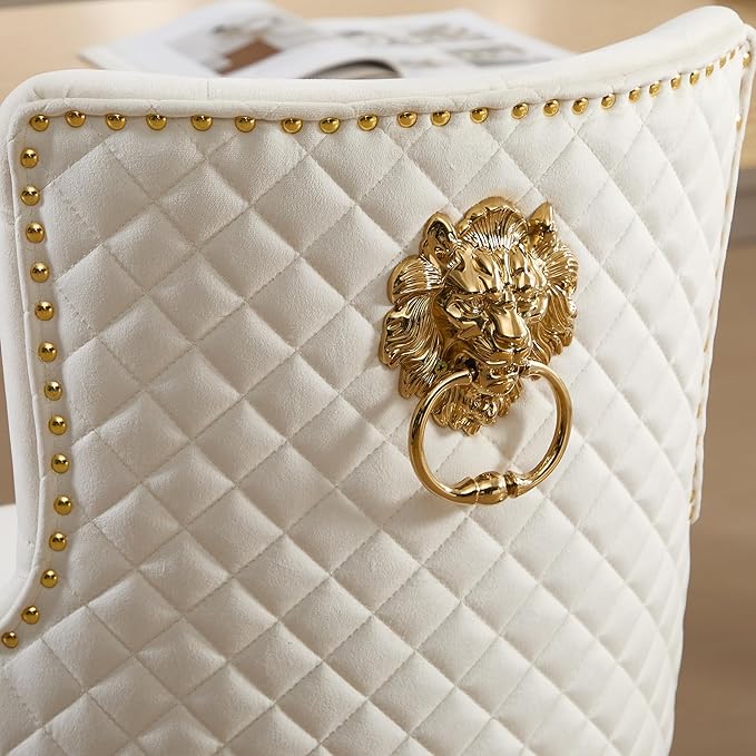Velvet Gold Barstools Set of 2, Modern Counter Height Adjustable Swivel Stools Chairs with High Tufted Backrest Golden Base Lion Head Pull Ring Diamond Pattern Rivet Trim for Kitchen, Cream