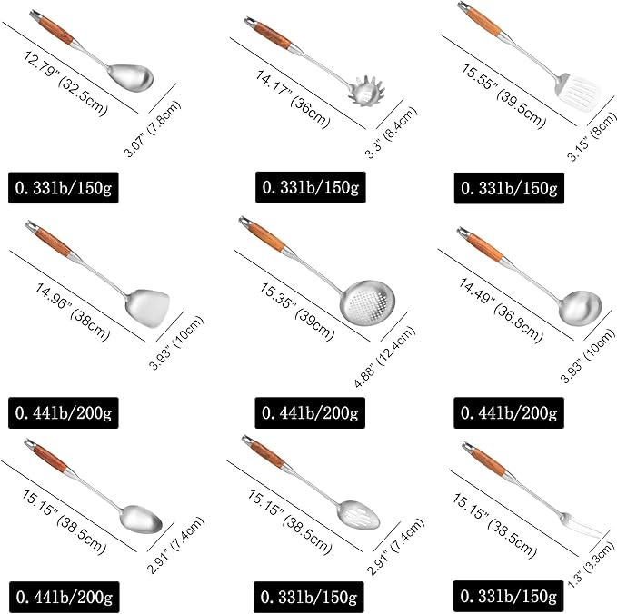 • Professional Kitchen Utensils Set: Clean lines, good weight and well balance. The wooden handles are not too heavy, help you eliminate stress on the arms and provide a comfortable ergonomic grip. Wooden handle reduce heat transfer, anti-scald, help you stay out of the soup or keep you away from the heat and flame.